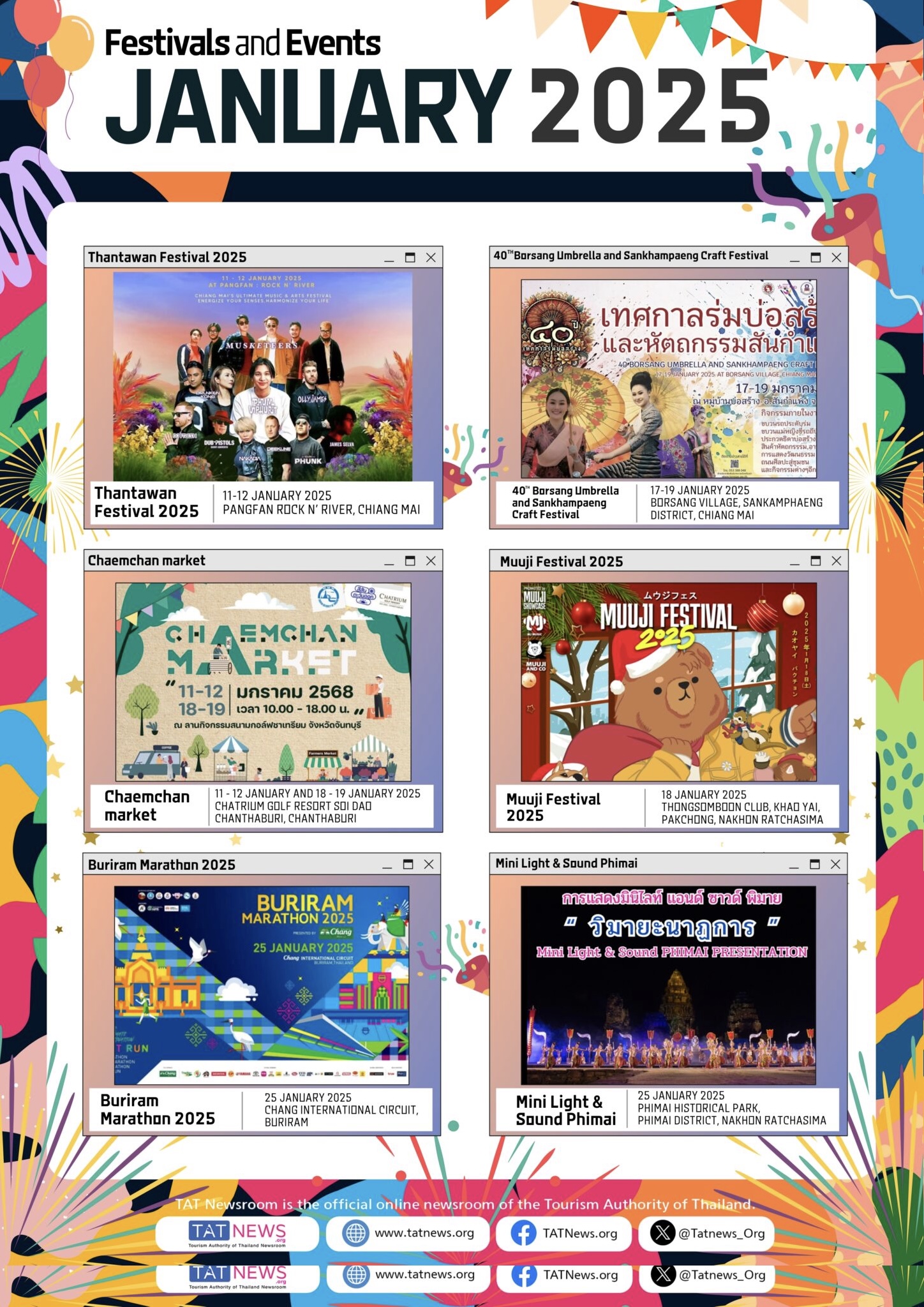 TAT, Jakarta - Sambut tahun baru dengan semangat baru! Thailand tidak akan pernah kehabisan ide untuk menyambut para wisatawan yang datang berlibur. Bulan Januari di awal tahun 2025, sudah ada berbagai event dan festival budaya yang diselenggarakan dan siap menawarkan pengalaman seru.